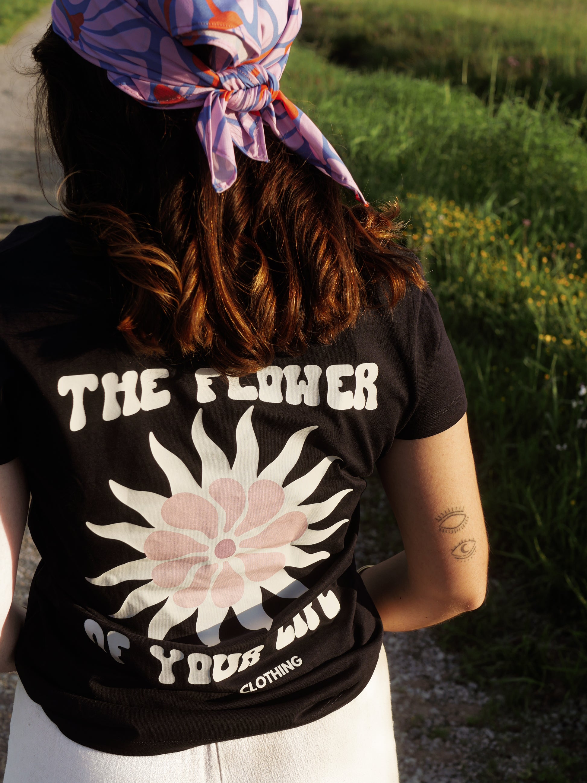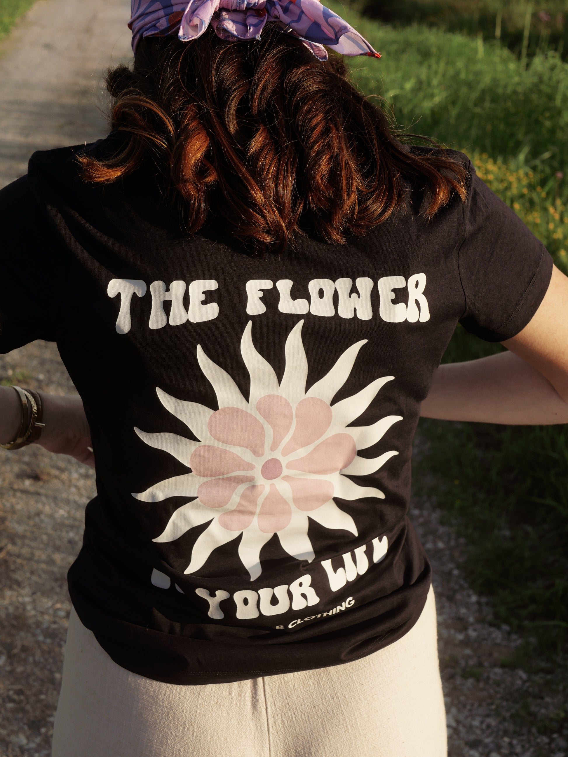 Le dos de ce t-shirt dévoile une grosse fleur pleine de vie, accompagnée du texte "The flower of your life" (traduction en français : la fleur de ta vie). Un joli rappel que chaque instant de notre vie est une fleur précieuse, qu’il faut cultiver et apprécier pleinement.